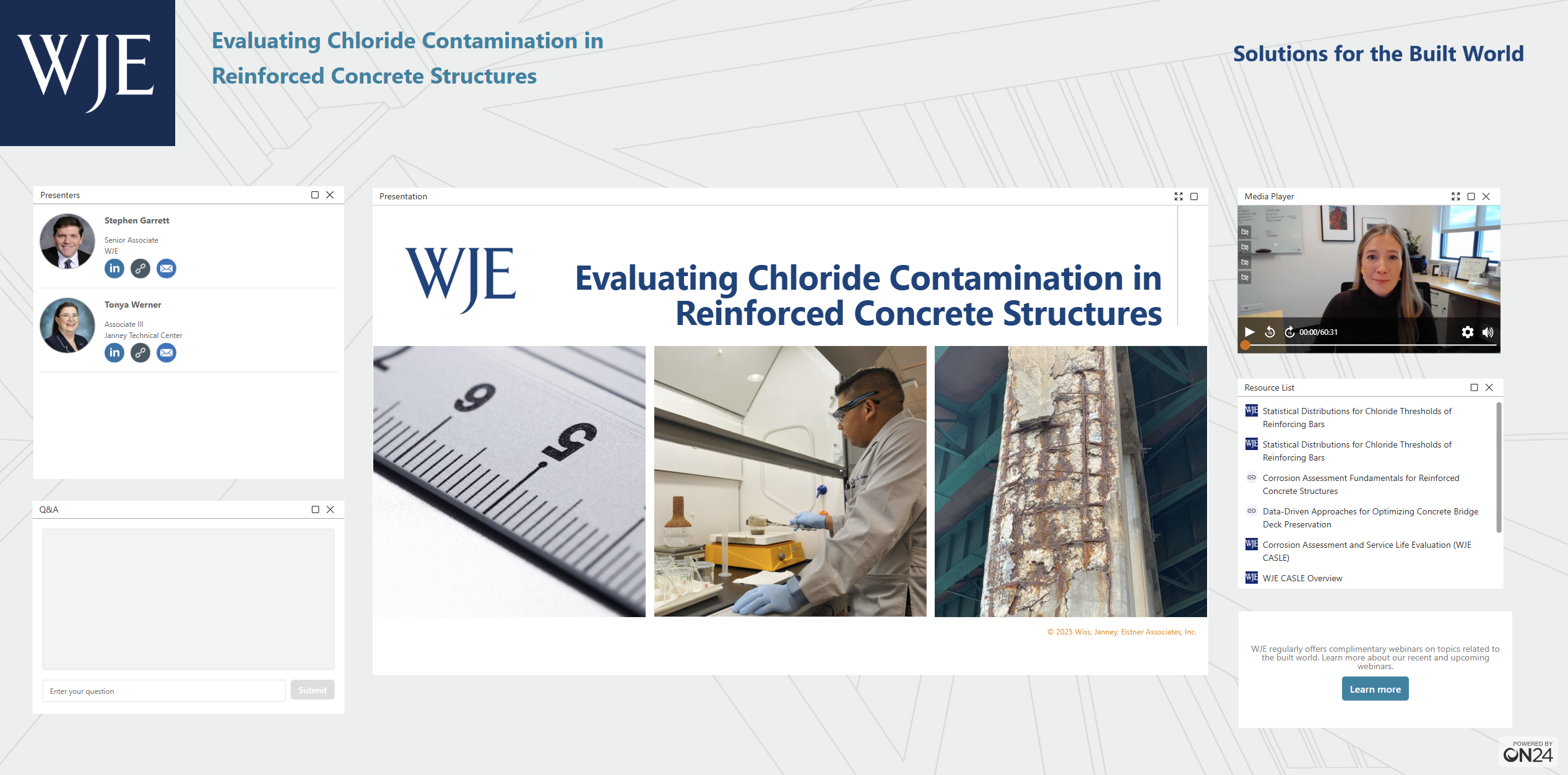 In this webinar, materials engineer Stephen Garrett and chemist Tonya Werner will help material suppliers, investigating engineers, and everyone in between get the most out of chloride testing. They will provide a brief introduction to the various standard methods available, along with a technical overview of the mechanics of chloride evaluation techniques from a chemistry perspective. Through recent case studies, best practices for field sampling and data interpretation will be discussed.