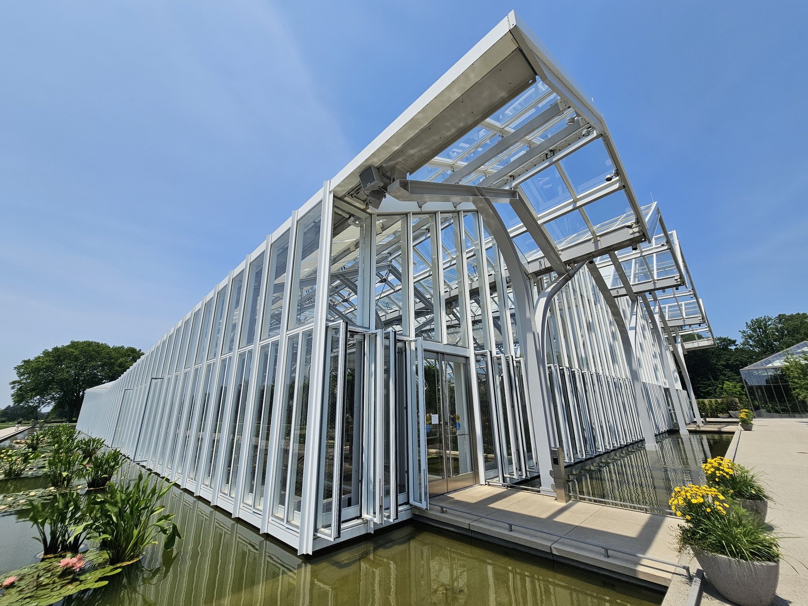 The West Conservatory is a new glass-enclosed building consisting of 32,000 square feet of underground basement and a 32,000 square foot elevated slab. The gardens, which are constructed above occupied space, appear to float on water, allowing the plants to thrive within a controlled environment. The water feature also includes movable planters.